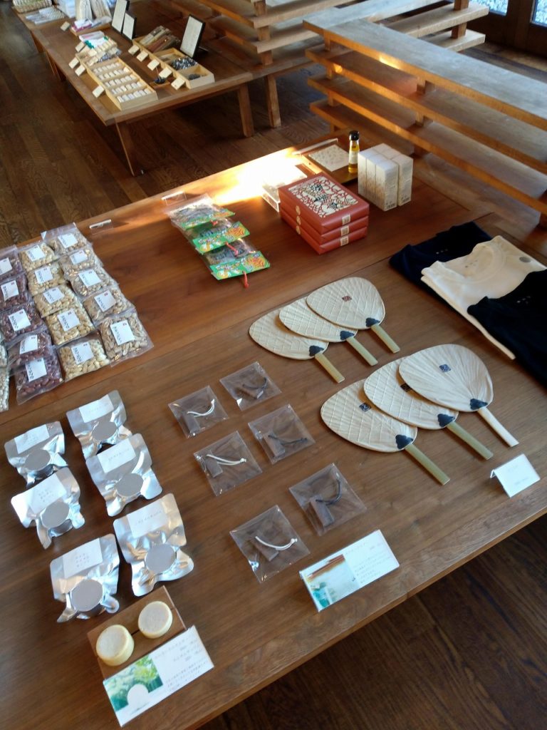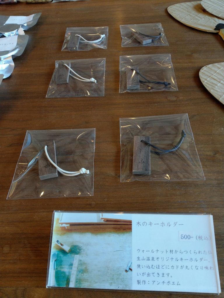 下駄箱のカギに模したキーホルダー・近くを走っている『ことでん』の車掌さんのブロマイド・しっとり温泉石鹸や風呂おけなども取り扱っています。