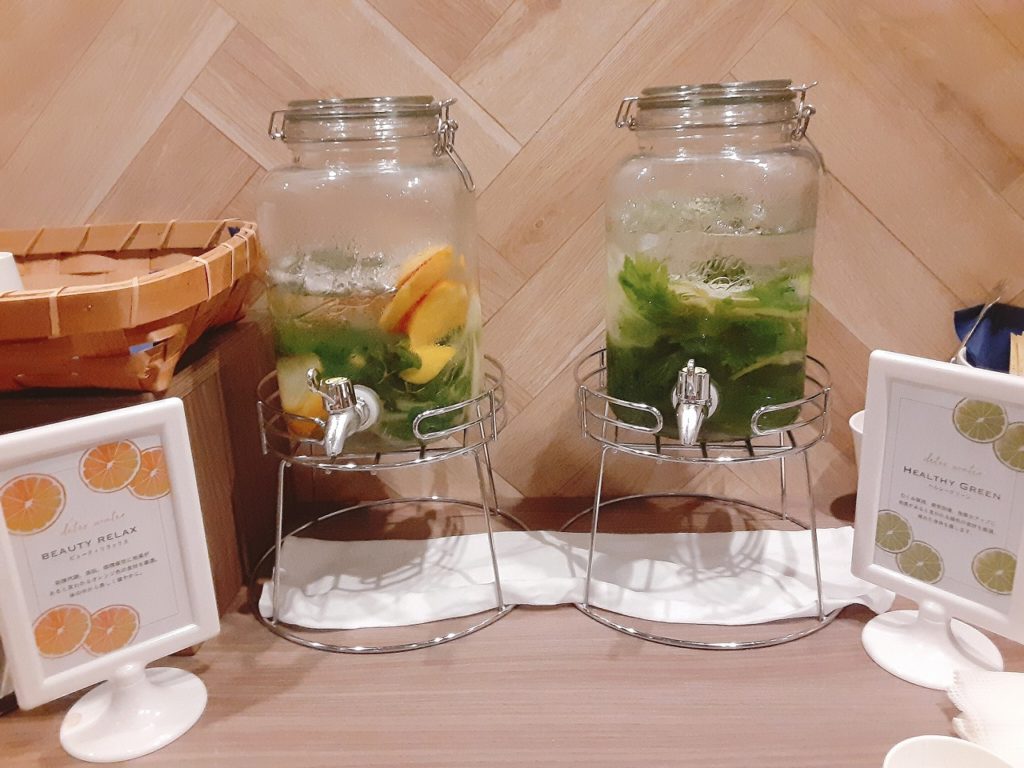 また、リラックススペースには代謝に良いといわれているデトックスウォーターも準備されて飲み放題になっていました!