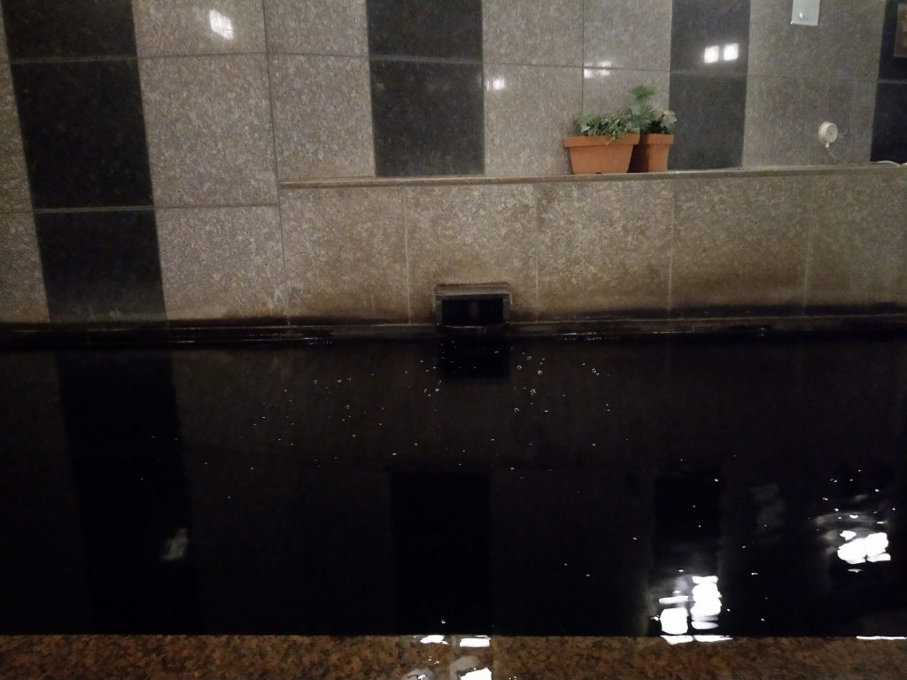 浴室内は黒い石床基調の清潔感のある造りとなっており、内湯には源泉掛け流しの水風呂『源泉浴』・加温のみの15人程度が入れそうな『温泉浴』と書かれた浴槽が設置されています。