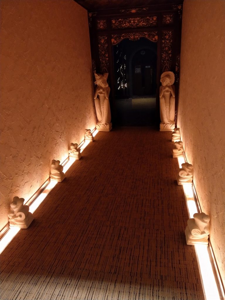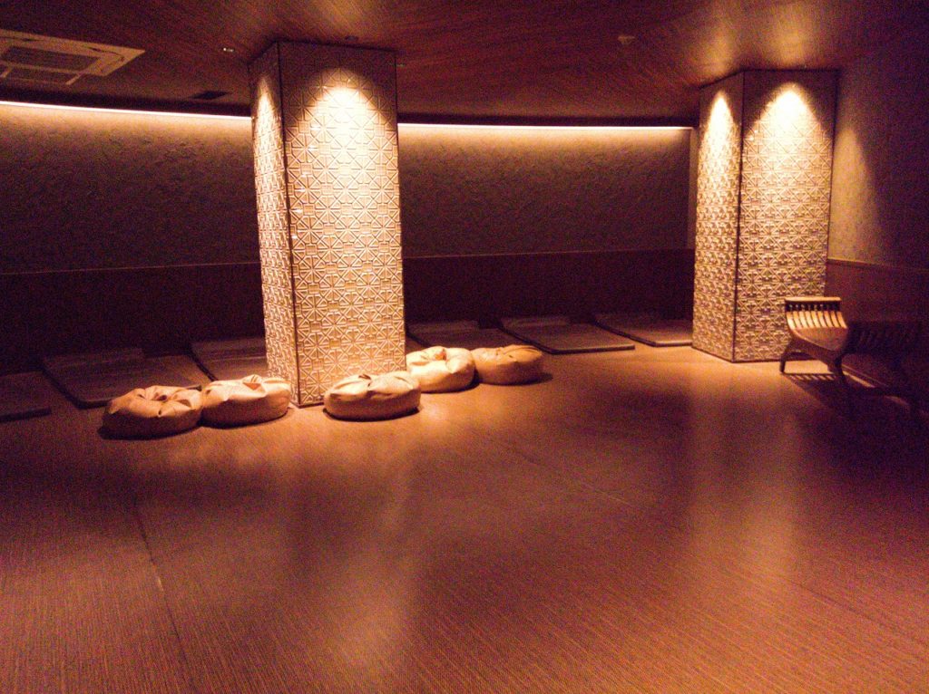 岩盤浴の入口 岩盤浴も静かな間接照明の利いた空間で、この点は他の岩盤浴施設と比べても優れていると言えるだろう。以前はドリンク販売コーナーがあったのだが、薄暗いうたた寝処に改装されていた。 |