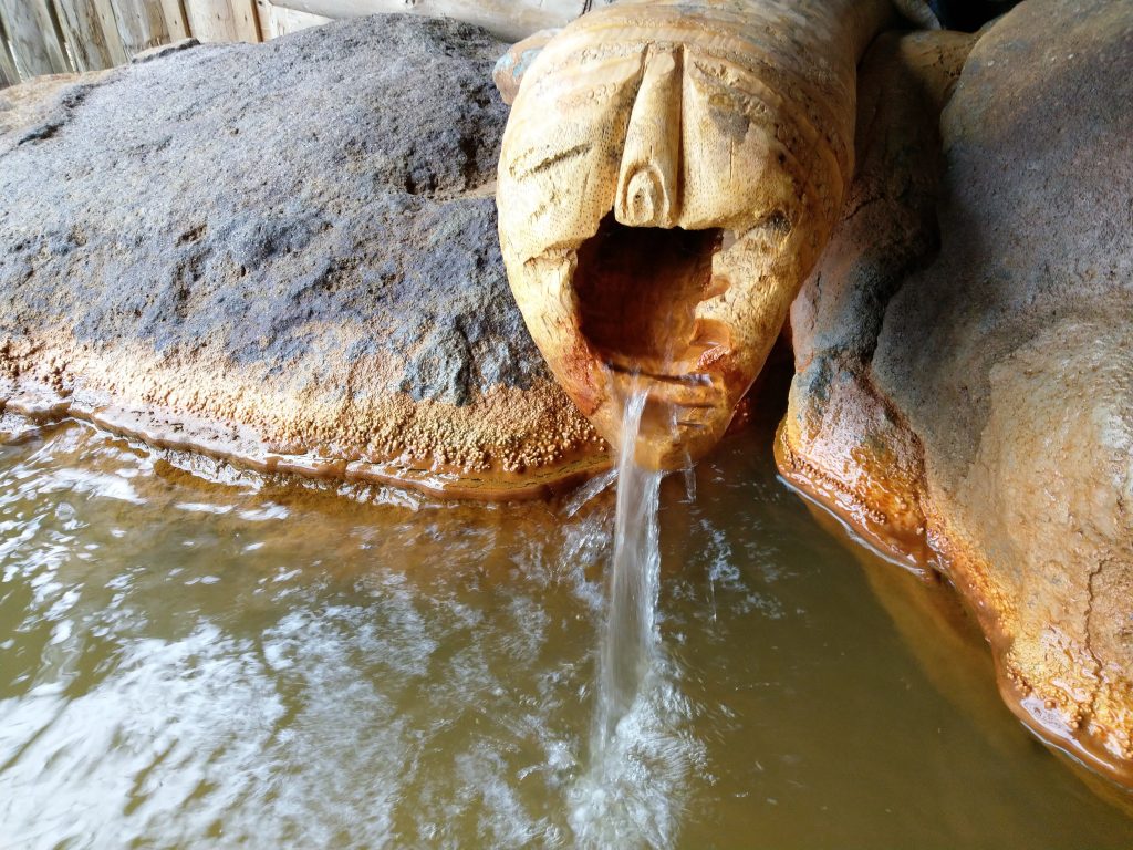 析出物の付着した素晴らしい源泉かけ流し 低張性 中性 高温泉 ナトリウム・カルシウムー硫酸塩・塩化物泉 オーナーから聞いた話によると、蔵王では比較的深めの1000メートルから温泉を採掘しているらしい。 非常に熱い源泉を先程訪れた遠刈田温泉『神の湯』では加水して冷ましていたが、加水していない事を加味するとこちらに軍配といったところか。 温泉は写真の通り先程行った遠刈田温泉と同様、茶緑の濃い温泉であるが、ほとんど味も無く匂いも仄かに硫黄臭がし浴後はナトリウム泉の影響か大変体がポカポカする温泉である。後で入って来た地元の人曰く、今日はこれでも薄い方らしい。 大きな岩から少しずつ源泉が掛け流されており、注湯口や浴槽、浴室が成分の影響で茶褐色に変色していた。 温泉成分の変色も強く掛け流しの個性を感じる事が出来た。 |