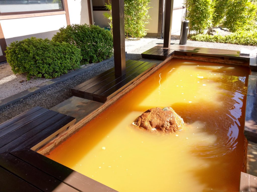 加温・消毒はあるが濁度の高い黄土色の温泉 源泉は内湯・露天どちらにも使用されており、見た目はガッツリ来そうな濃い黄土色の塩化物泉である。 湧出量が50㍑/分と量的にこれで加水や循環がされていないのは、かなり奮闘している印象を持つ。 使用掲示を見ると、加温と消毒がされている掲示があり、匂いは完全に失われてしまっていた。 無味でナトリウム・カルシウム泉特有の苦みや塩味は感じられなかった。しかしタオルで源泉を拭うと茶色く変色するなど個性は完全に失われてしまっているとは言いがたい温泉でもある。 露天の注湯口からはイメージ通りの金気臭がはっきりする温泉が提供されており、浴槽の切り口から溢れさせている。一応広義の掛け流し基準は満たしている感じの温泉である。 |