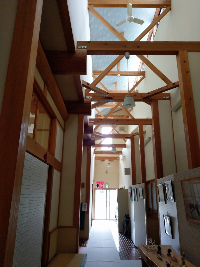 郵便局が近くにあり、駐車場が広い。当日は曇りだったが、天候がこれから悪くなるのかツバメが何匹も低空飛行で飛び回っていた。入口にATMがあったりするのは公共施設としての性格も併せ持っているからなのか。館内には邦楽のピアノ曲がトロトロ流れていた。