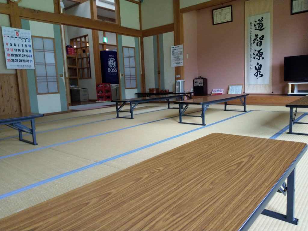 内湯・有料休憩所・物産コーナー 浴室はシンプルで10人入ると手狭になる大きさで内湯のみの構成となっている。 有料休憩所もあるが、27畳・長机5個ぐらいの大きさで疲れて一服したい時を除けば、特段お金を支払って過ごす程では無いかもしれない。 水曜日は無料開放日となっているらしく、運よく自分は無料で使用できた。 |