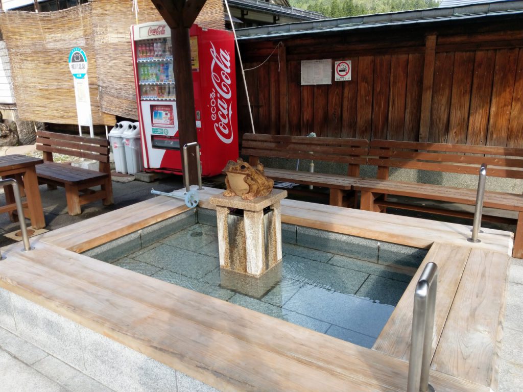 カエル親子のオブジェのある足湯