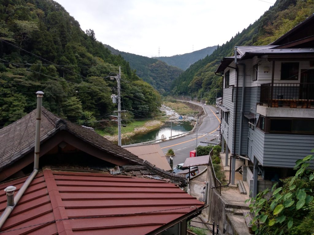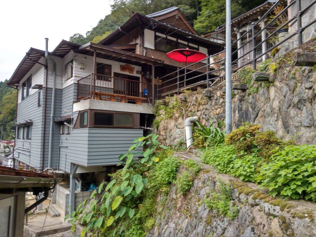 国道313号線峠道の集落の様な場所にぽつんと立てられており、廻りの旅館・建物は古くここだけ時代取り越された様な錯覚さえ覚える。