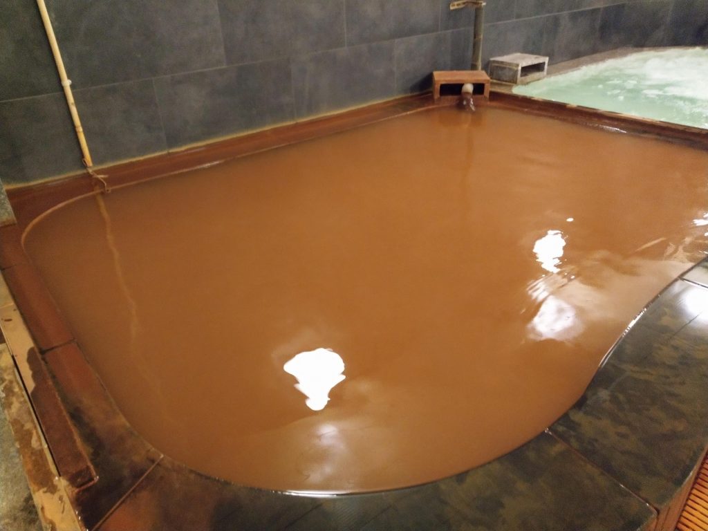有馬温泉の金の湯みたいな源泉を掛け流して提供している・・ 五階で館内着に着替えエレベーターで浴室に入り驚いたのだが・・6-7人程度のが入れる浴槽に有馬温泉の金の湯と同じ明るい茶色の源泉が浴槽から掛け流されている。驚くことに温泉の特徴である鉄臭もしっかりし、注湯口には成分を濾しとる網も設置されておいる。網の中には粉の様な成分が溜まっている。。