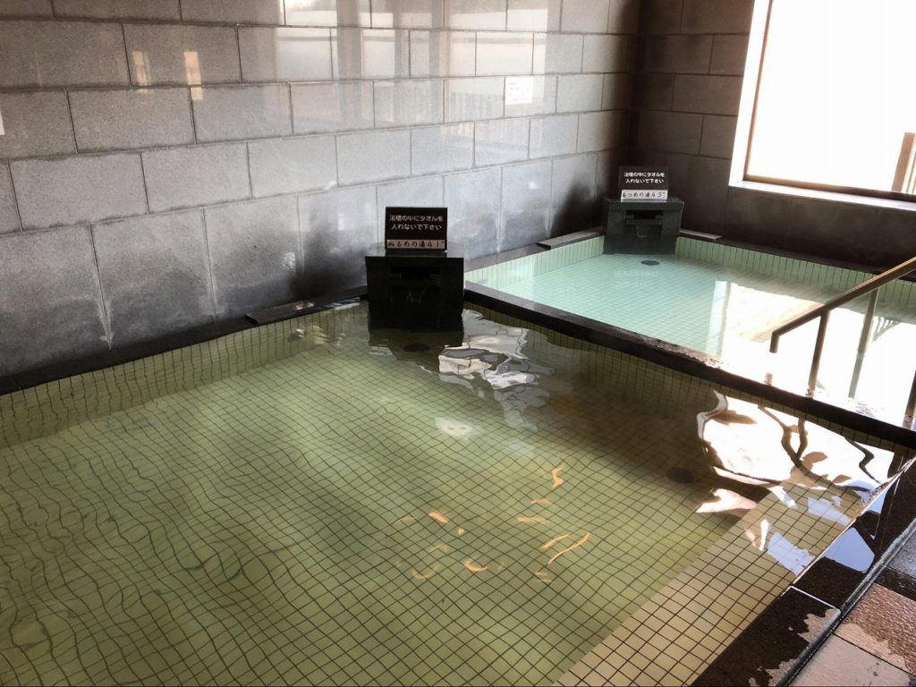 浴室・食事ともに簡素ながらも申し分なし 〔浴室内設備〕 温泉の浴槽は2つあります。奥の浴槽があつめの湯で43度、手前の浴槽がぬるめの湯で41度になっています。好みや体調に合わせて選べるのが嬉しい所ですね。サウナと水風呂も完備されています。