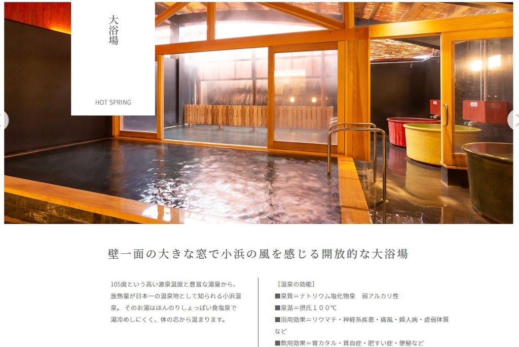旅館の目の前には橘湾が広がっています。日帰り温泉で利用できる大浴場からは見えませんが、宿泊プランで利用することができる「部屋湯」からは橘湾を眺めながら楽しむことができます。