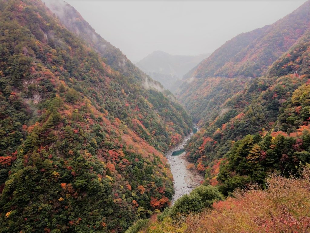 あいにくの強雨の中の来訪だったが、山々の紅葉にモヤがかかり、これはこれで景色は抜群・・。