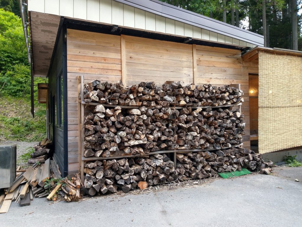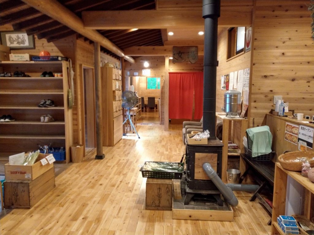 駐車場を降りると薪が重ねてあったり、森林に囲まれ自然に囲まれた木々の匂いが気持ちをリフレッシュさせてくれる。外観はレトロなログハウスといった感じだが内装は新しめ。