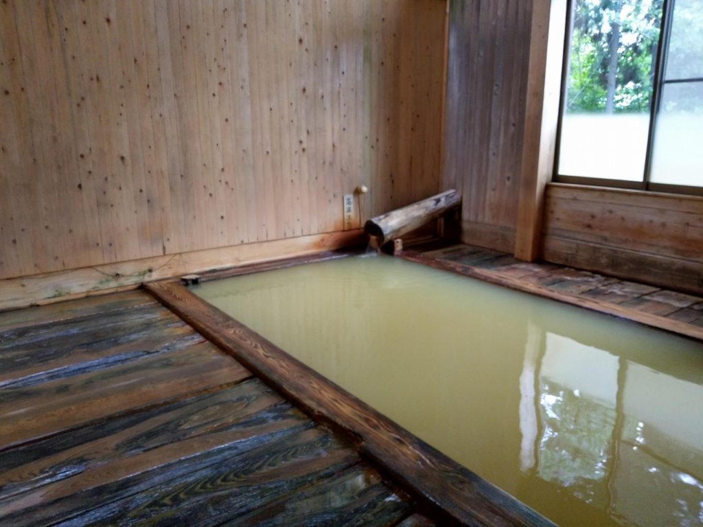 鉄・金気臭の入り交じった爽快な匂いのする掛け流し温泉 ■低張性中性温泉 内湯に10人程度が入れそうな浴槽一つで勝負している温泉で、丸太を真ん中だけくり貫いた筒から源泉を掛け流している。動力掲湯で48.9L/分と田舎の温泉としては心許ない湧出量である。使用状況が何処にあるか分からなかったものの、源泉温度と天然の匂いが思ったほど強くない点から推察するに加温と消毒はしているのでは無いかと推察される。 しかし浴槽正面見て右側に『源泉』と書かれた木札が張られた温い温度でかけ湯の様な小さい貯湯槽もあり・・ここの湯はしっかりと金気臭と鉄臭が丁度良くブレンドされたような爽快な匂いがした。更に浴槽に丸太から注がれている湯も同様の匂いが感じられたので掛け流しも随時併用して使われていると思われる。 ブラシーボ効果なのかもしれないが普通の温泉より発汗が早いような気がし、成分的にも新鮮さを感じさせる湯であった。