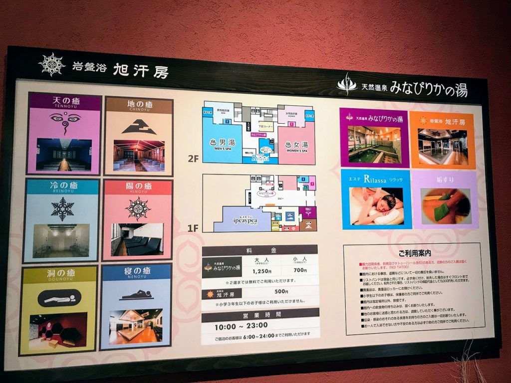階段を上がるとき、温泉の案内がありました。岩盤浴は1階にあるようです。