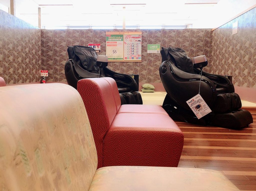 休憩室は男女共用のスペースで椅子とソファ、マッサージ器・寝転がれるスペースとあったが女性はあまりリラックスしにくいかも。 |