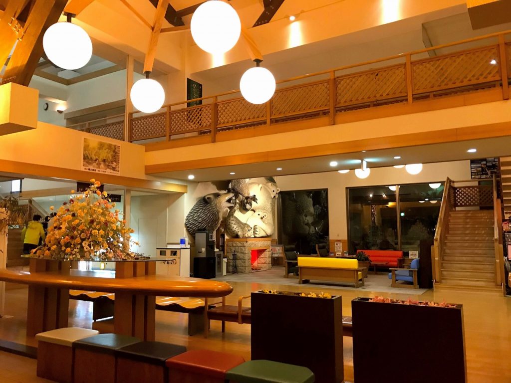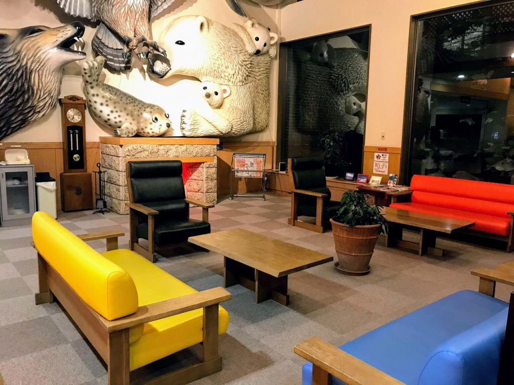 広く天井まである窓のあるロビーには、カラフルなソファーと旭山動物園の動物たちの大きなモニュメントが壁一面に飾られていました。