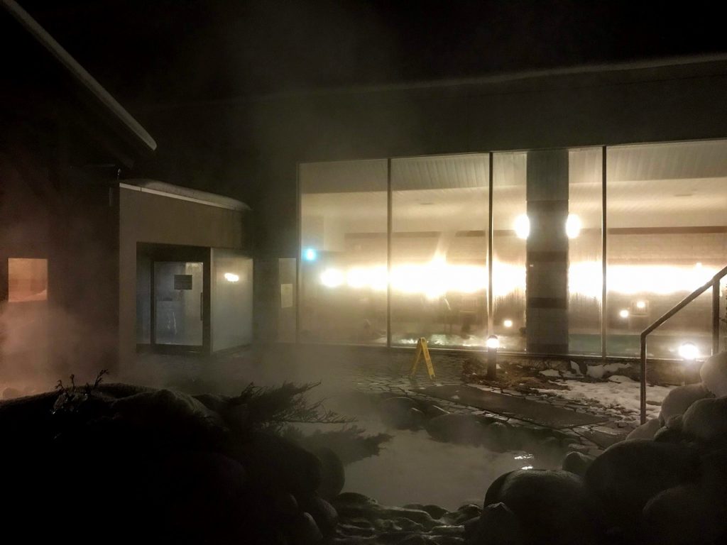 露天風呂は高低差がある場所に二つあり、囲いは何もなく景色は最高だった。夜に行ったためはっきりは見えないが、晴れた昼間は大雪山系の山々を見渡すことができるだろう。 露天風呂は少し温度が高めの湯舟と、ぬるめの湯舟があり、広い露天風呂は浅瀬が広くとってあるため小さな子どもも安心して入ることができるようになっていた。