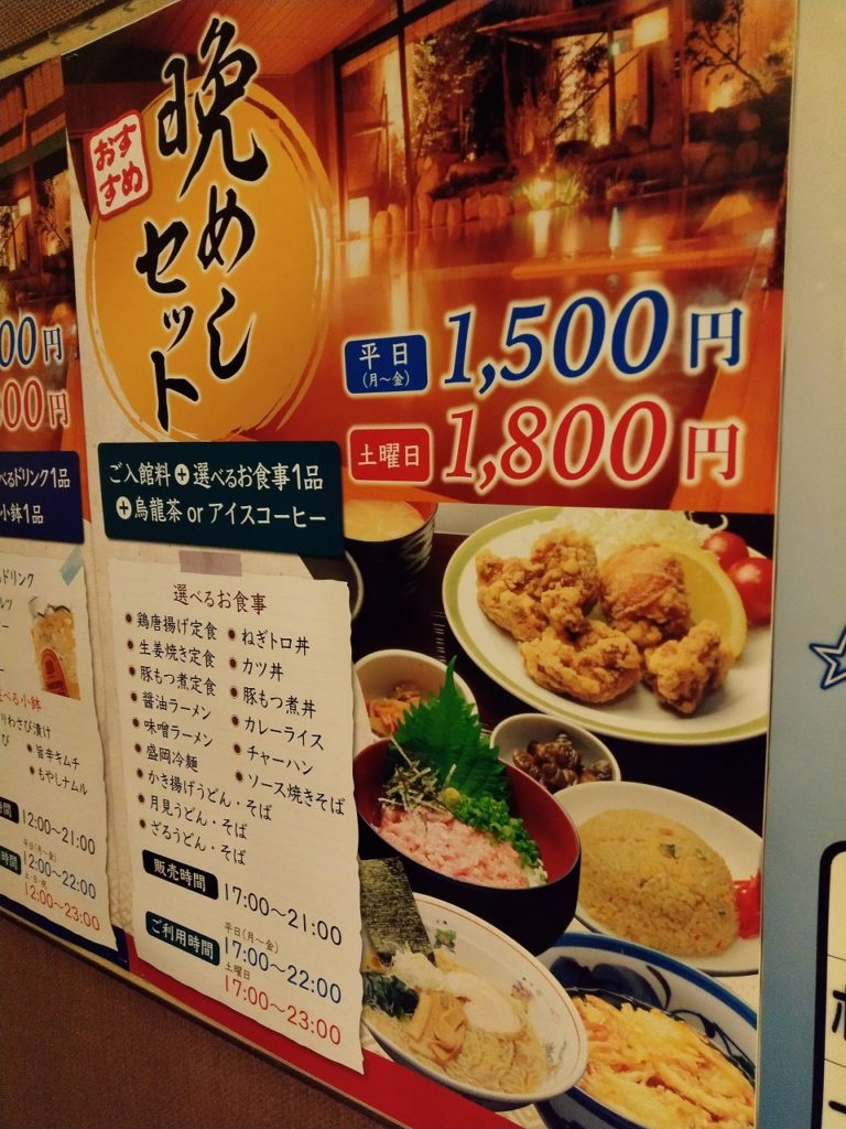 数年ぶりに来訪したが、うたた寝処のハンモックが撤去されていたりするも、1500円で『晩飯セット』なるプランが新設されていた。定食とドリンク付きで入館料金1100円を比較して考えればお得感が感じられるセットである。