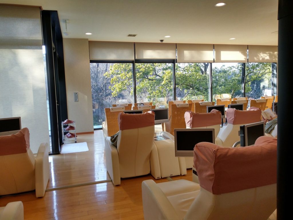 リクライニング席から日本庭園を眺められたり、仮眠できる薄暗い部屋なども設けられている。