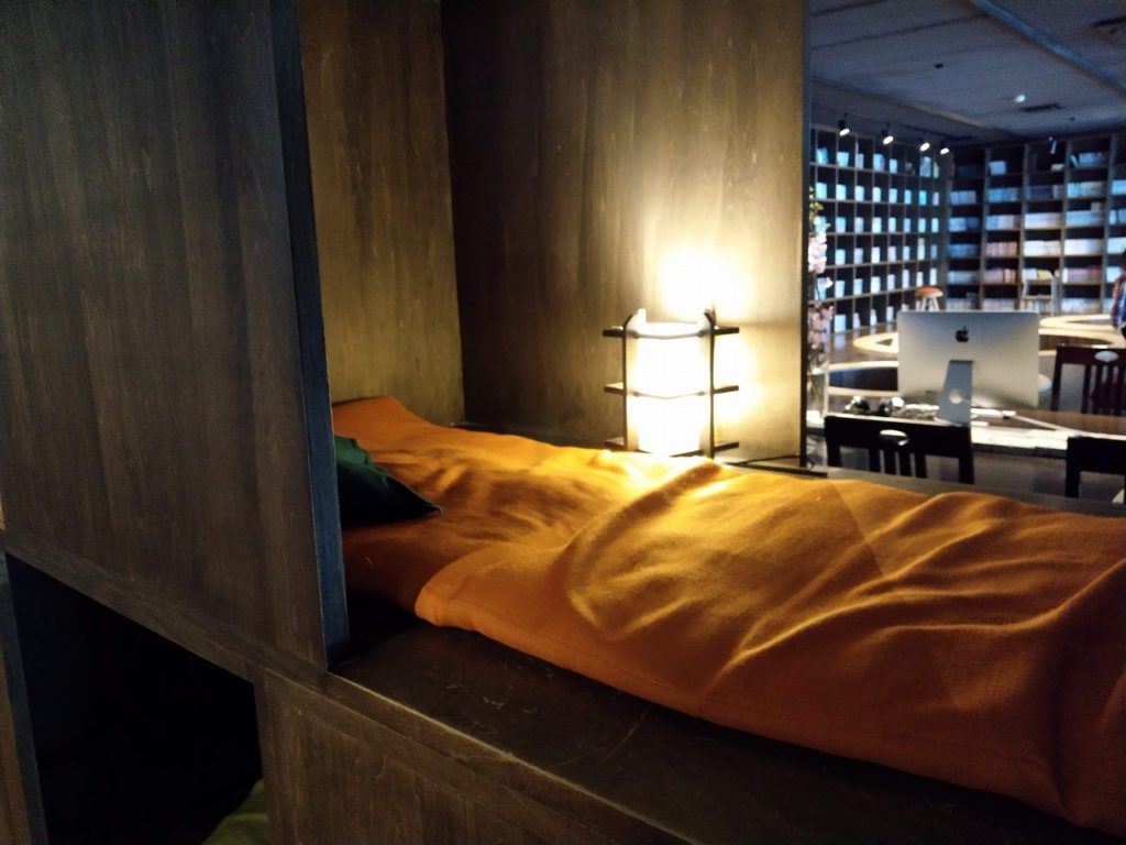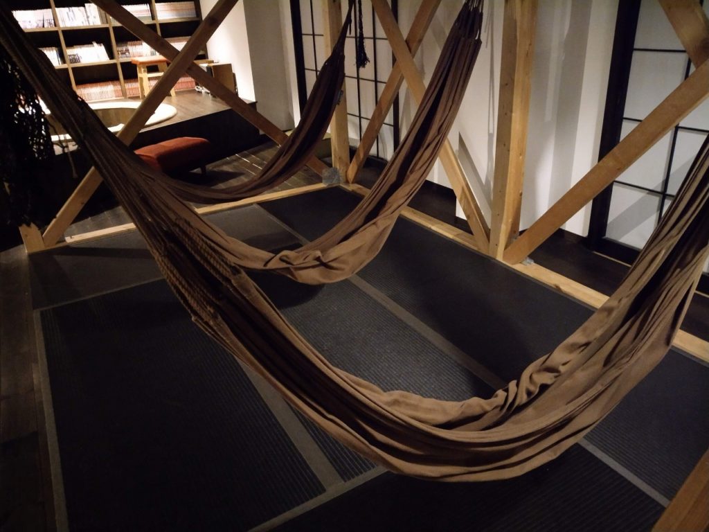 ■うたた寝コーナーも充実・ハンモックもあり 1Fに薄暗いうたた寝コーナーも設けられており仮眠も可能。うたた寝コーナーは他のマットレスと違いフカフカで心地よい。 更に箱形のカプセル型みたいなうたた寝処もあり、こちらはおしゃれ感が漂う。 ハンモックも3つ設置されており、お籠もり・休憩スポットとしても優秀な施設である。筆者もハンモック揺られながら読書を楽しんでいたが酔ってきたので断念する。