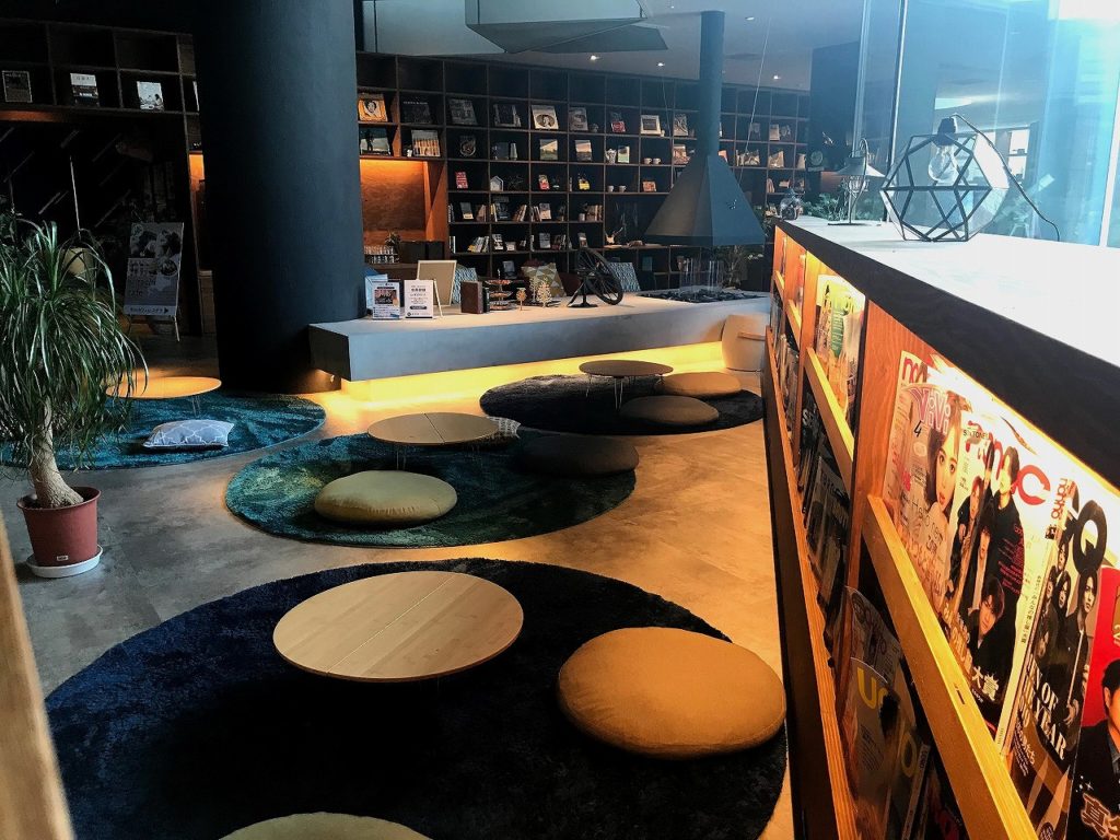 入館すると目の前に受付が、右側にはオシャレなカフェのような内観でした。ふわふわのカーペットにローテブルやクッション、たくさんの最新雑誌やコミックが並びます。