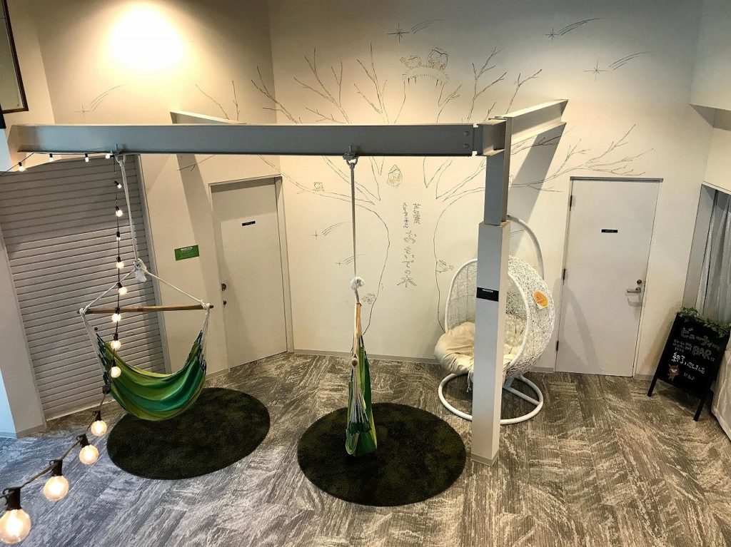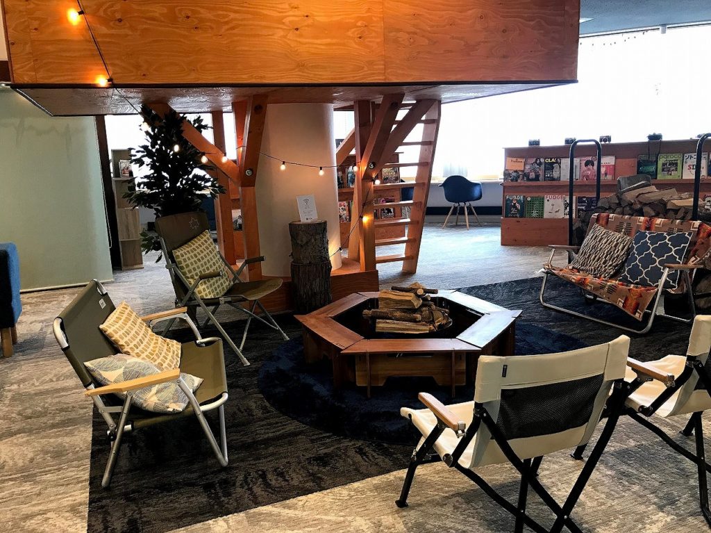 アウトドアを意識した椅子や焚火台、テーブル、ハンモックなどが置かれ、まるで室内にいながらキャンプしているかのような楽しい雰囲気です。子どもが登れる木の上の秘密基地、大人がゆっくりと読書できるスペース、WiFiやコンセントの完備などリラックスできる細やかなサービスがあちこちにありました。