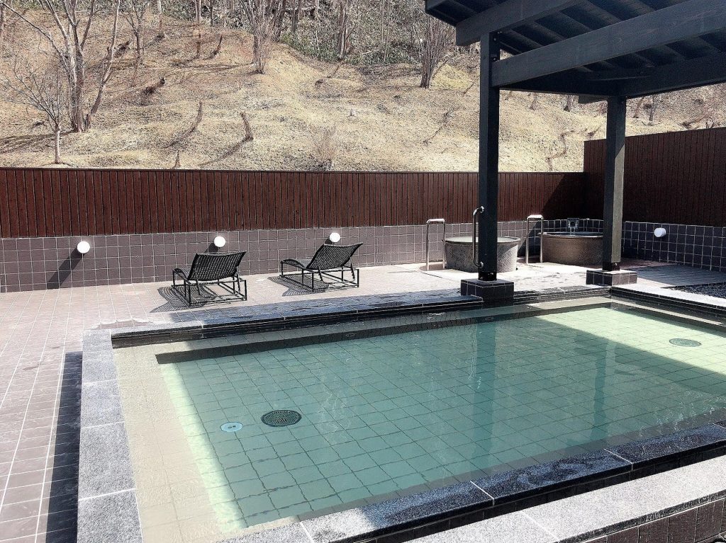 露天風呂は、大きな湯舟と壺風呂が二つありました。大きな湯舟は20人ほどが余裕で入れそうな広さがあります。周囲は山に囲まれているので夏は緑に、秋は紅葉に、冬は真っ白な樹氷に囲まれて露天風呂を楽しめることでしょう。 また、夜になると露天風呂の屋根に星空が渡英される仕掛けがあり、子どもも楽しめそうです。 |