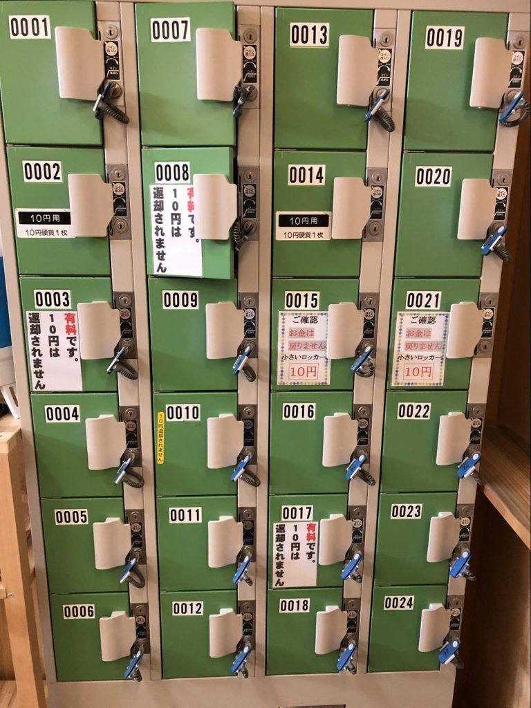 トイレと貴重品ロッカーは脱衣所にあります。貴重品ロッカーは10円を使用するタイプのもので、硬貨の返却はないようです。このタイプはちょっと珍しいかも。