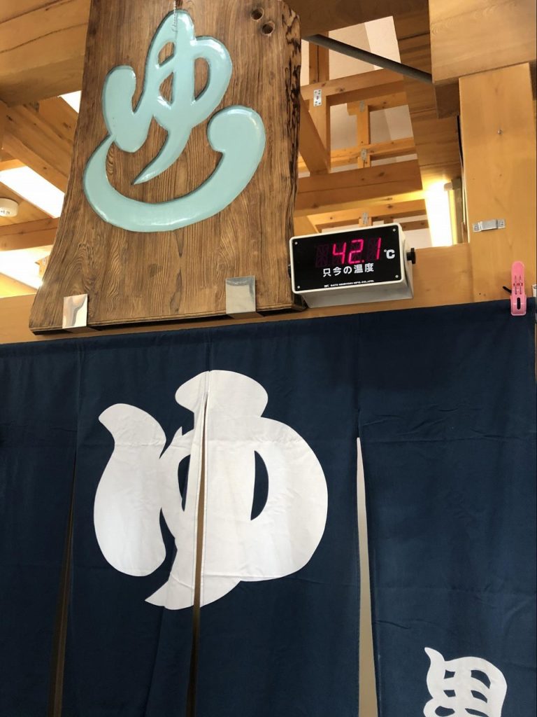 浴場のささやかな気配りが高評価 〔浴室内設備〕 脱衣所に入る前ののれんの上には、現在のお湯の温度が表示されています。