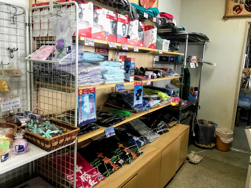 また、小さな売店もありました。十勝岳の登山口なので登山をする人向けのサポーターや靴下、フェイスタオルやアンダーウエアなども並んでいましたよ。