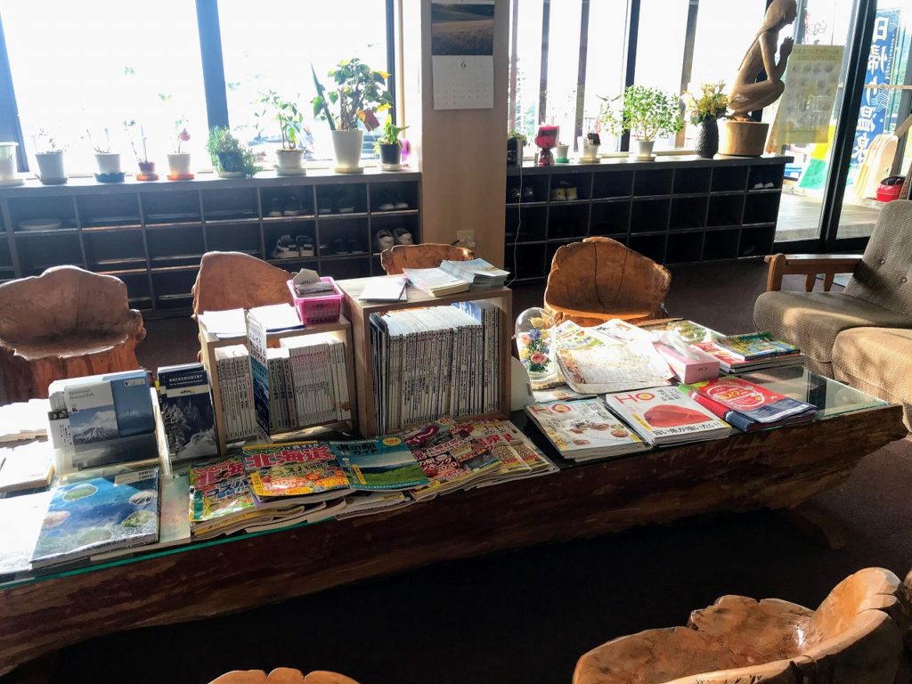 テーブルの上には、北海道の旅行雑誌や登山情報雑誌、キャンプ・アウトドア雑誌がいっぱい!様々な情報を得られそうです。
