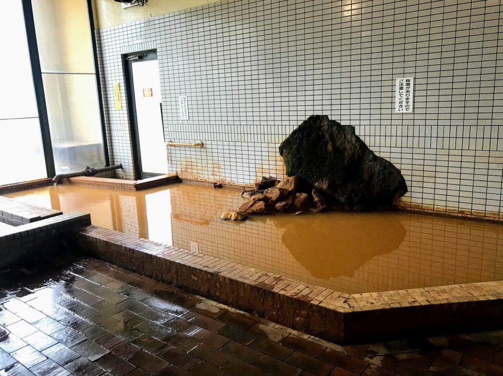 内湯は広い湯舟とサウナ、水風呂がありました。サビ色をしたお湯はちょうどよい温度です。足元が全く見えず、段差がわからないので注意しながら入りました。匂いもありますが、嫌な匂いはなく、温泉独特の硫黄のような匂いです。