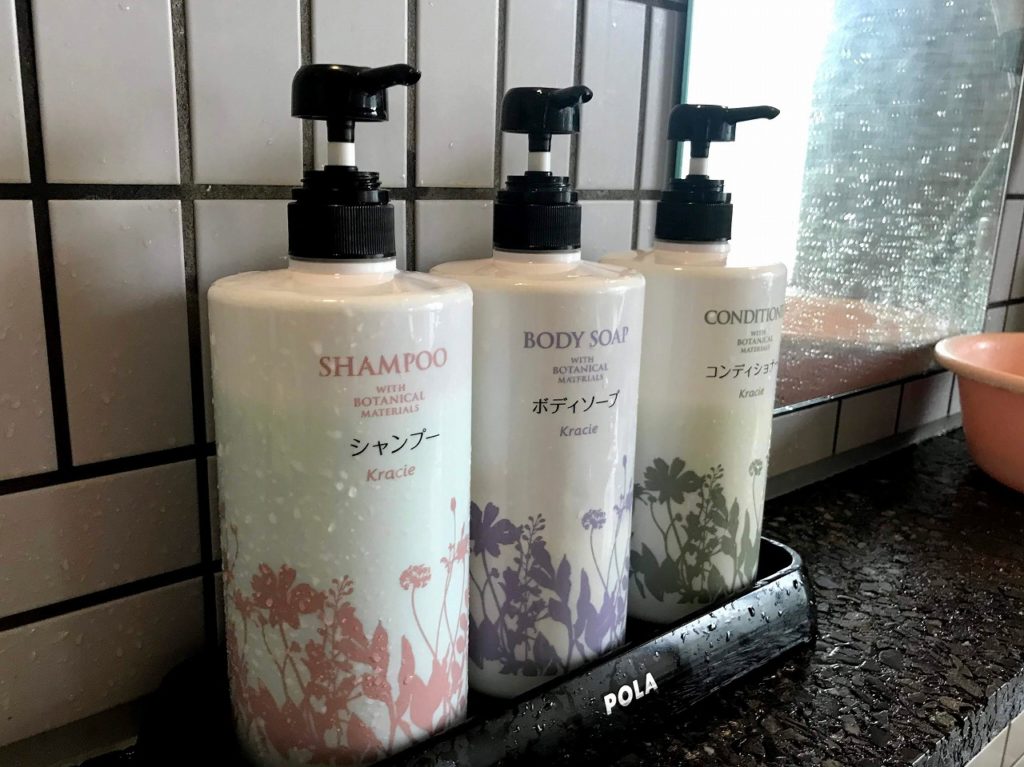 シャンプー・コンディショナー・ボディソープが設置されていたので、手ぶらでOKです。シャンプーをしたら露天風呂へ行ってみましょう。
