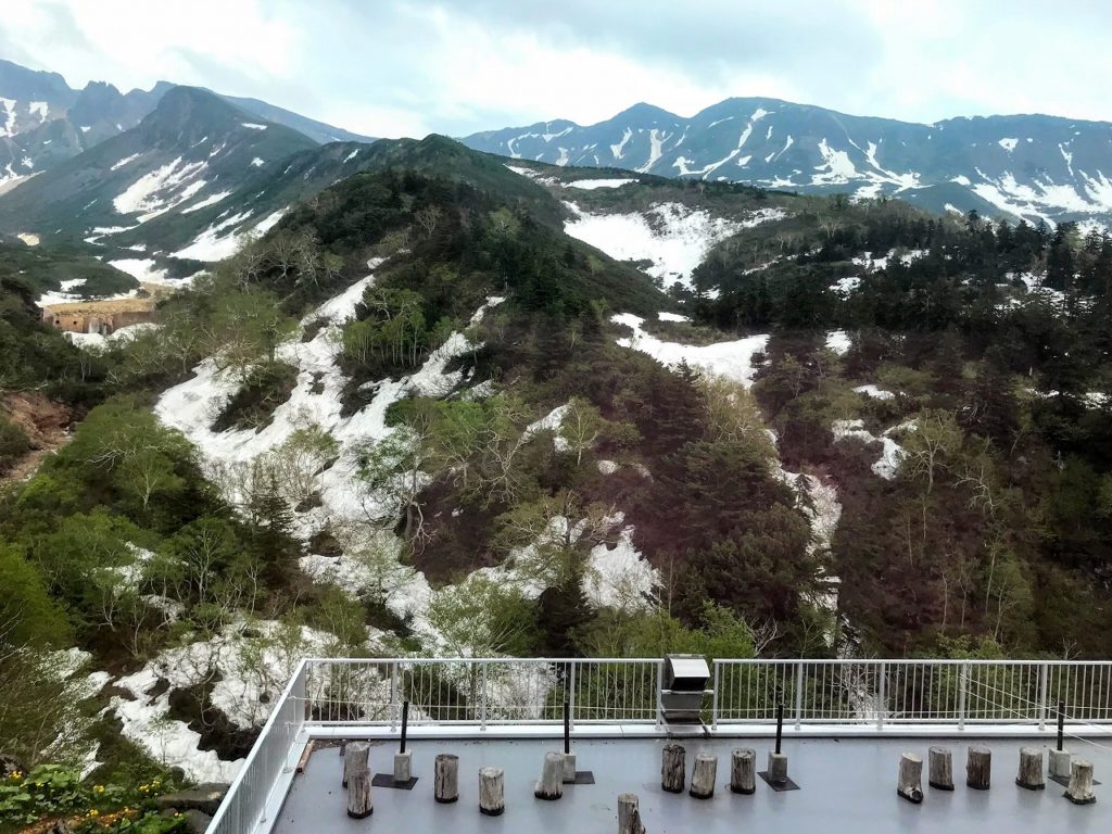 温かな温泉を出た後も、十勝岳連邦の景色を楽しめるよう、テラスがありました。野鳥の声が一日中聞こえ、高山の何とも言えない湿った空気を感じることができ、まるで登山をしているかのようです。 宿泊をすれば、窓からこの景色が見られる客室もありますが、ぜひこちらのテラスへも足を運んで見て頂きたいです。 |