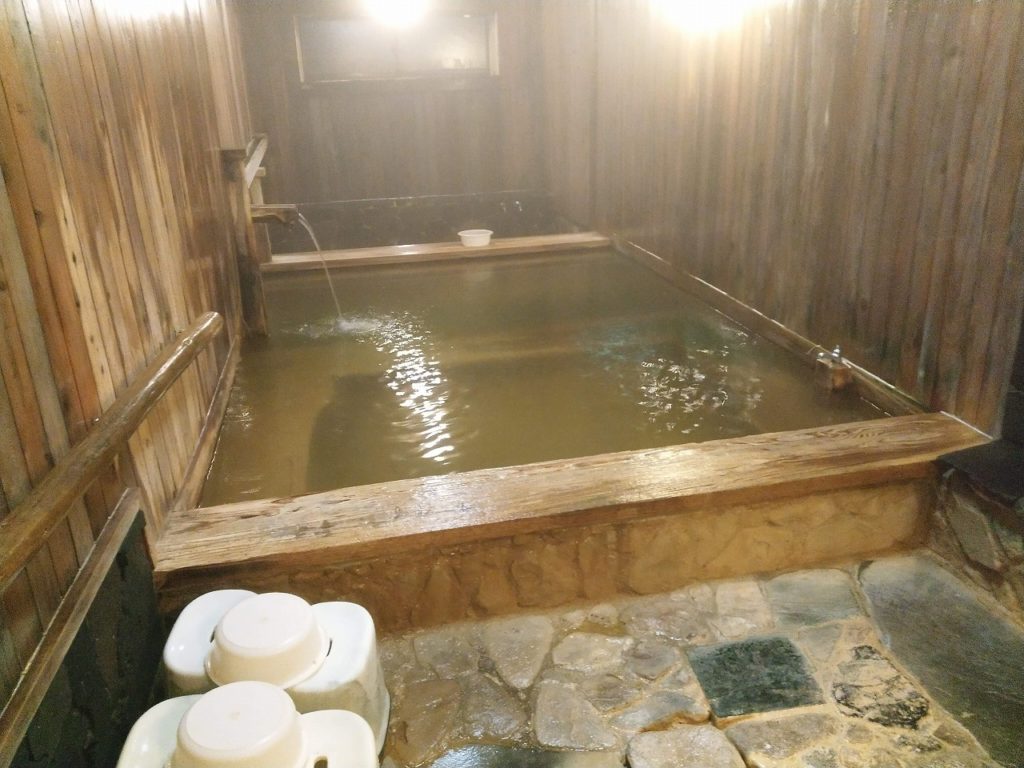 匂いは藻の様な匂いで、ぎりぎり底が見えるぐらいの濁度の黄土色の湯。炭酸水素泉との事だが、炭酸感は特に感じられない。口に含むと味噌汁みたいな濃すぎず、薄すぎずみたいな丁度良い湯であるが、高張性温泉である為か、数分ぐらい浸かるだけでも汗がほんのり出てくる。 浴槽が変わった造りをしており、二つの浴槽が平行しておいてある奥に謎の空間(浴槽?)があり、お湯は張られて居るが掛け流しと言うほどオーバーフローはされていない。少しずつ無駄遣いせず浴槽に提供されている。