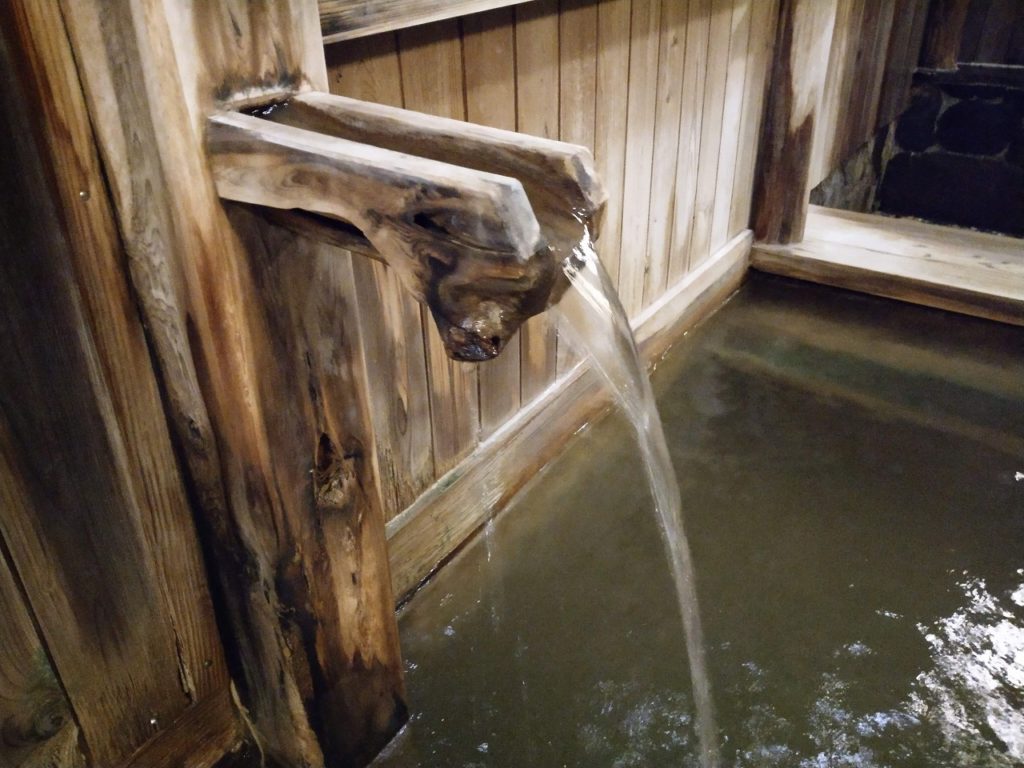 しっとり感・浴後保湿感の強い炭酸水素高張性自噴温泉 高張性中性冷鉱泉 [泉質名]含二酸化炭素-ナトリウム-塩化物・炭酸水素塩冷鉱泉 [成分量13.1g・pH6.3・泉温10.8℃] 温泉は内湯のみで10人は入れないかな・・ぐらいの木の浴槽に外から内湯に樋(筒?)を通して温泉が掛け流されている。