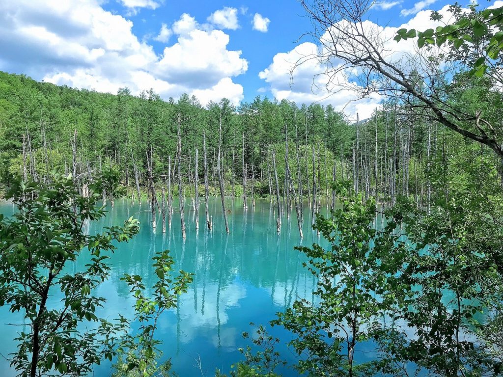 美瑛ブルーと呼ばれる北海道・美瑛町の景観は、全世界から注目されている自然がいっぱいの街です。青い池は美瑛町の中心部から車で約20分ほどの場所にある白金温泉への道沿いにあり、夏は大渋滞になるほど人気のスポット。