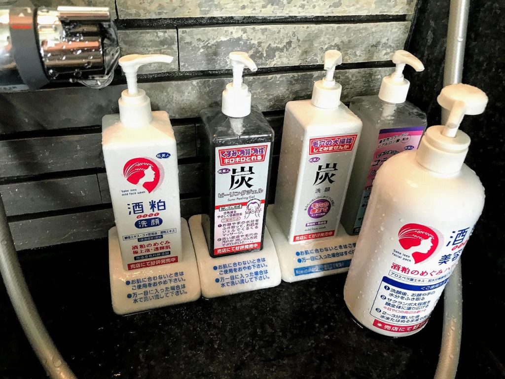 酒粕や炭を使ったシャンプーなどが置いてあります。いい香りで髪もしっとりしたので、きっと人気でしょうね。