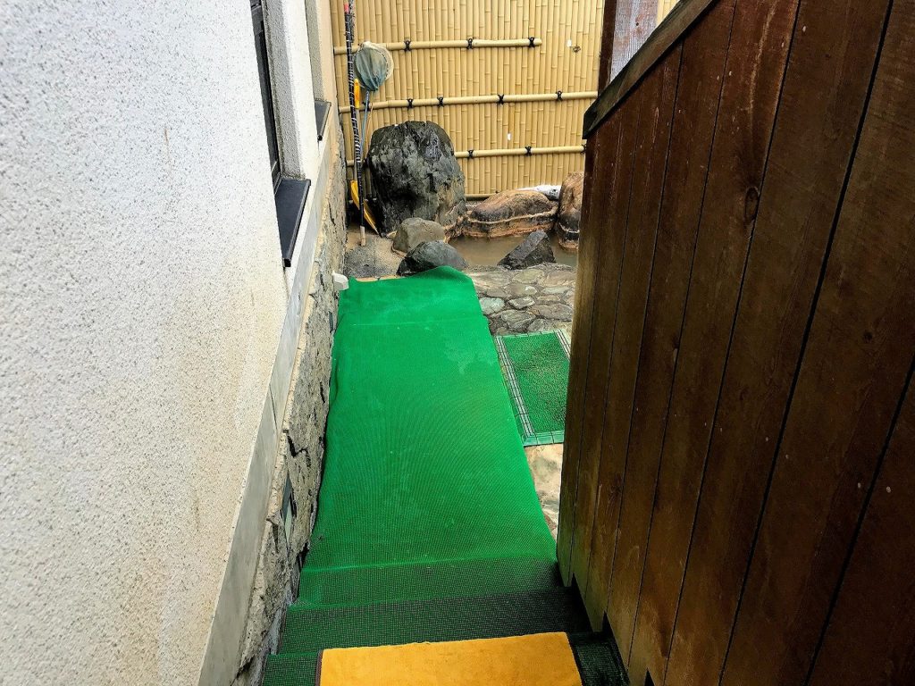 露天風呂へは階段を下りて向かいます。人工芝の上にきれいなバスタオルが敷いてあるので、シニアの方や足元が心配な方でも安心して下りていくことができますよ。