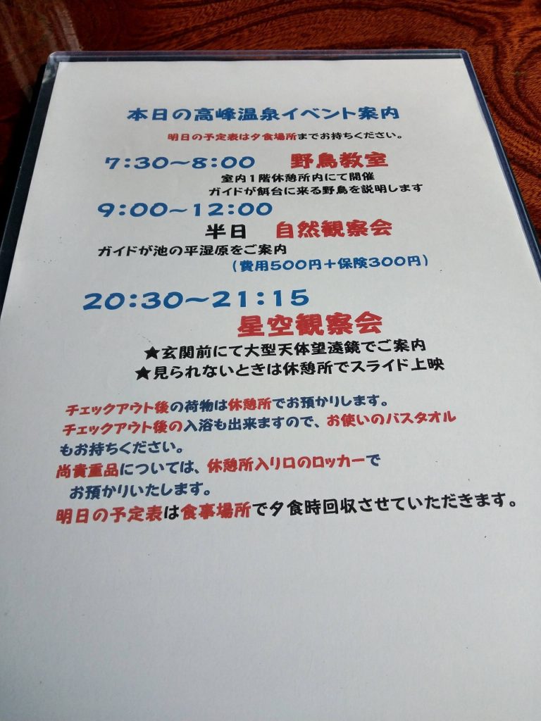 なお、上記でも述べたが保険料込みで朝9-12時に800円で『自然観察会』なる周囲の池の平湿原を周遊するガイドサービスも行っている。今回は予定があったので参加しなかったが、次回また宿泊する機会があれば参加したいと思う。