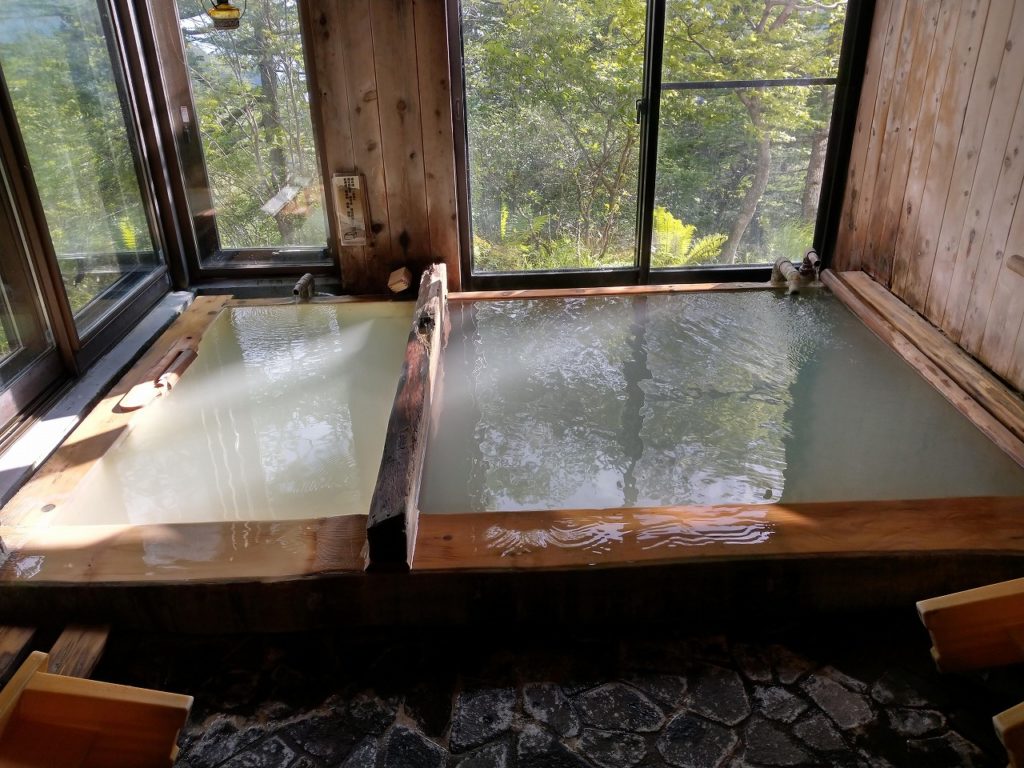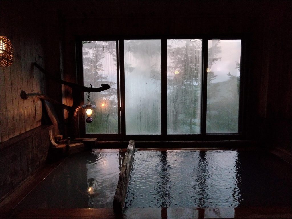 これだけでも充分なのだが、この温泉の最大の売りは③の露天の展望風呂である。一階の裏手から50m程森林の中を歩いた先にある温泉で極上の青白く硫黄臭のする源泉が少しずつ掛け流されている・・。