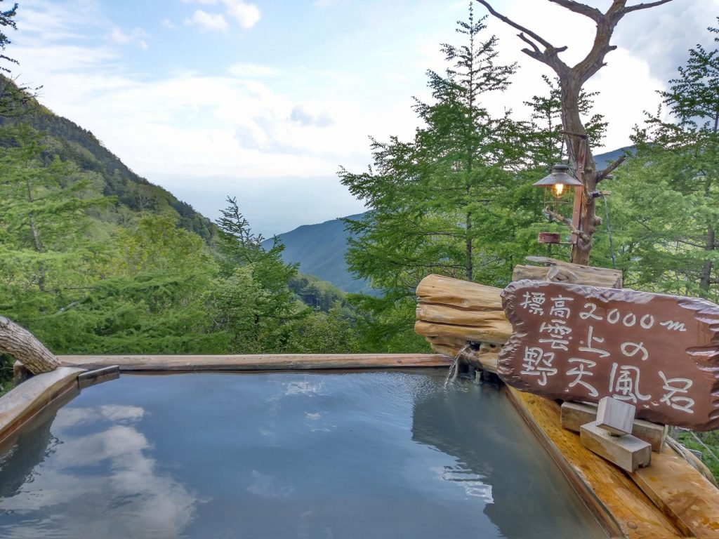 インスタ映えするようにか『標高2000m雲上の野天風呂』と大書きされた看板を尻目に雄大な山々と、その奥にそびえ立つ山々を眺める事が出来る。温い泉温なのでゆっくり湯に浸かることが出来、時間を忘れてしまいそう。