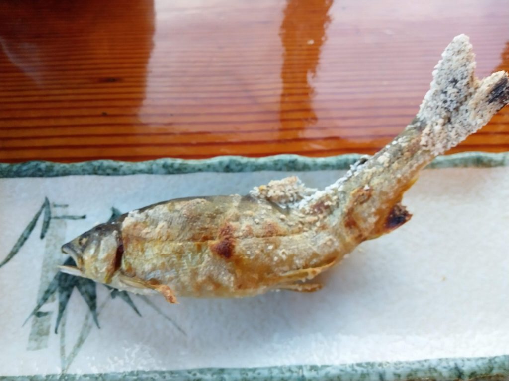 今回は一泊二食付きのプランを選択。夕食は二階のフロア真上の食事処でいただく。茶碗蒸しや鮎の塩焼き・野草(?)の天ぷらなど自然から採れた物を純粋に利用した食卓に舌鼓をうたせて頂いた。夕方だったので山々から見える夕焼けも大変綺麗だった。