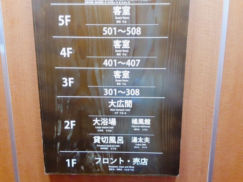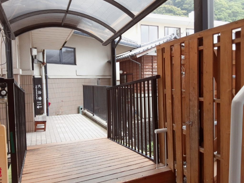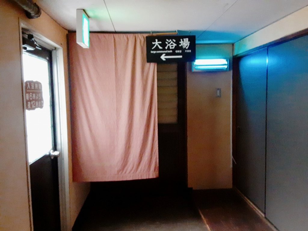館内は昭和の雰囲気が強く残っていました。エレベーターや階段は少し古めかしい雰囲気ですし、照明が付いている部分が少なく暗がりを進むこともあったんです・・。 お客様が私ひとりでしたので、節電されていたのかもしれません。つたや旅館の日帰り温泉を利用するさいに気を付けてほしいことはたった一つ「雨の日はやや利用しづらい」ということです。 なぜなら、つたや旅館の大浴場は2階に設置されているのですが、いったん外にでる必要があるためです。館内の表示にしたがって歩いていると屋外にでる扉に繋がってしまうので焦ってしまいました。 屋根はついているのですが、外に面している通路を通らなければいけません。