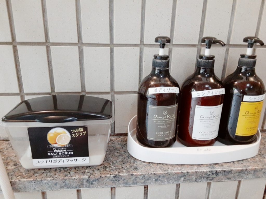 マッサージ用に設置されているのですが、このスクラブとってもお肌がつるつるになるんです。かなり粒が大きく粗いため、強くゴシゴシしてしまうと皮膚が真っ赤になってヒリヒリしてしまいますので注意しましょう。 しかし丁度よい力でマッサージしたあと塩がとけるまで時間をおいて流すと肌がトゥルトゥルになりますので試してみてください! [付帯設備]