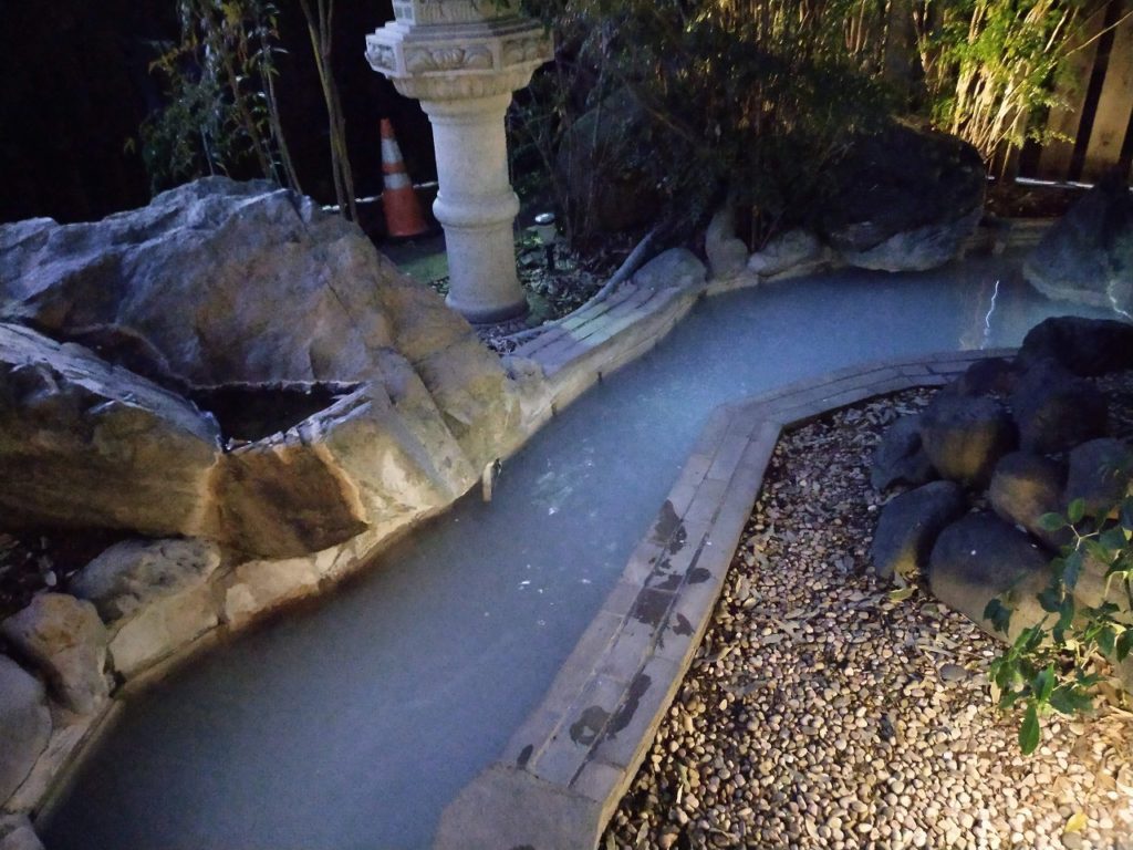 ヌルヌルトロトロの浴感良好な黒湯を提供!! 等張性弱アルカリ性温泉 地下1500mからくみ上げた湧出量122ℓ/分の濃い黒湯をほぼ全ての浴槽に提供している。 加温・循環・消毒表記があるものの黒湯独特の臭気も残されており、特段湯質が劣っているようには思えない。僅かに塩っ気も感じられる個性の強い湯である。 露天の壺湯が他の温泉より黒湯特有の匂いが強い感じがするが、その他浴槽も見劣りしない立派な湯である。 毎晩全ての湯を抜いて清掃し新たな湯を入れ替える分、塩素消毒は少なめ出来るという表記があり